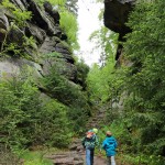Sonntagswanderung vom Kirnitzschtal, Parkplatz Nasser Grund durch die Eulentilke und Wilde Hölle auf den Carolafelsen im Nationalpark Sächsische Schweiz. Rückweg über den Reitsteig, Hinteren Heideweg und Dieterichsgrund zum Beuthenfall. Von hier über den Flößersteig an der Kirnitzsch zurück zum Nassen Grund.